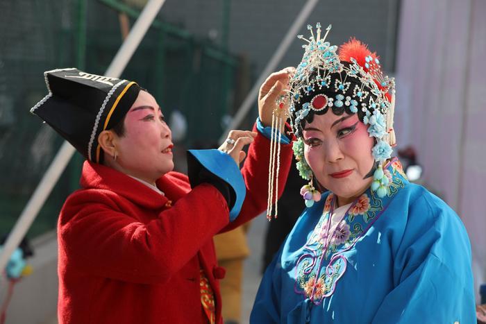 1月29日,在温县文化广场,演员在演出前化装。新华社发(徐宏星摄)
