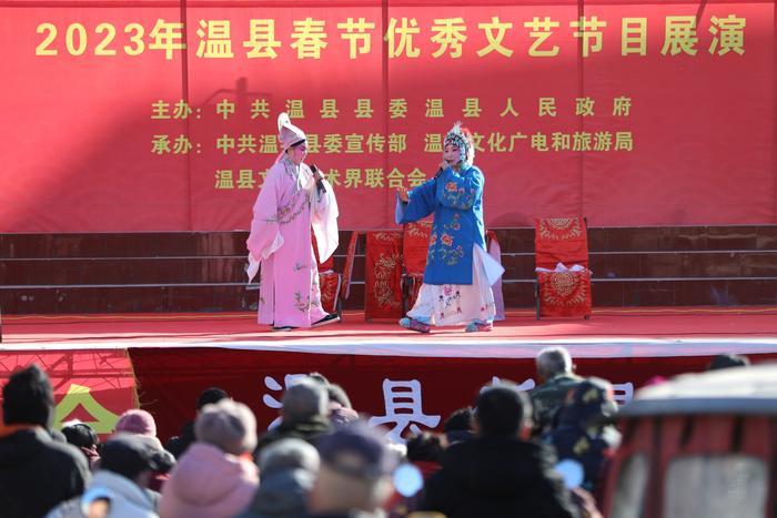 1月29日,在温县文化广场,演员在表演豫剧。新华社发(徐宏星摄)