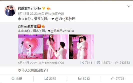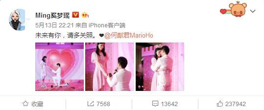 晚间,奚梦瑶在微博分享了现场照片,并发文:“未来有你,请多关照”。稍后,何猷君转发并甜蜜回应,称:“未来有你,请多关照。”照片中,何猷君一身白色西装,单膝下跪求婚,奚梦瑶身穿粉色连衣裙,一脸幸福的娇羞,在粉色背景墙的映衬下显得格外漂亮。