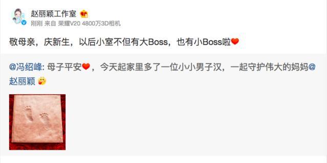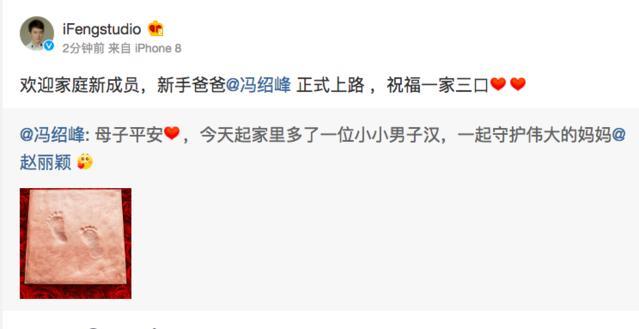 3月8日,冯绍峰在微博晒出宝宝的脚丫照宣布妻子赵丽颖产子喜讯:“母子平安,今天起家里多了一位小小男子汉,一起守护伟大的妈妈@赵丽颖 ”。