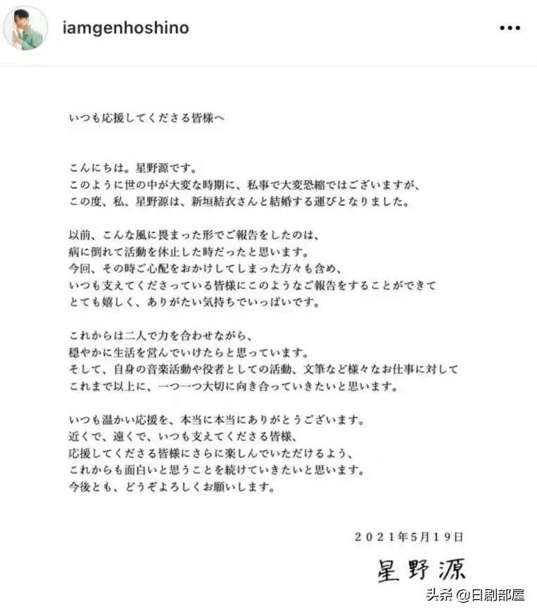 新垣结衣(32岁)和星野源(40岁)宣布结婚。