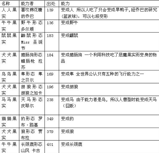 动物系的恶魔果实可以让人变形成动物,总共有人型、兽型、人兽型三种变化。由于动物系只有强化肉体的能力,所以有人认为动物系在近身肉搏战中应该是最强的。
