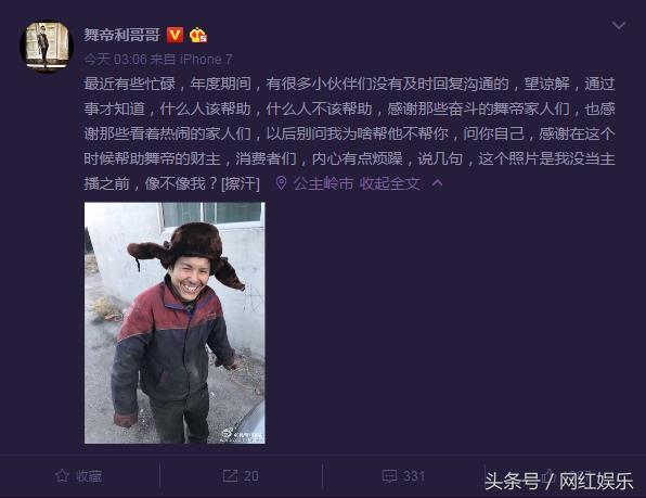 今天凌晨,利哥更新了微博动态!怪不得利哥能成功,凌晨三点都不睡觉啊!利哥在微博中感恩这段时间支持舞帝的财主与游客们,但亮点是下面的配图!利哥称,这是自己五年前没做主播修车的照片,小编越看越想笑,五年前的利哥也太low啦!哈哈!