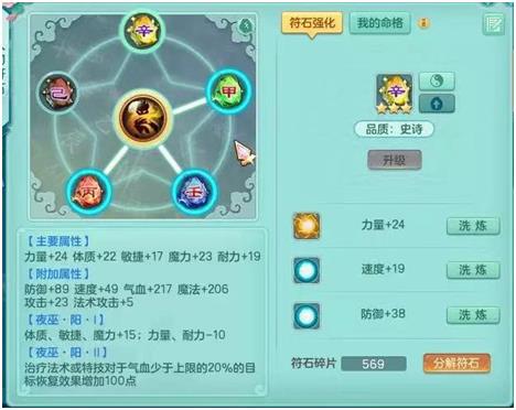 对于符石已有的附加属性进行洗练,可以选择保留就附加或者接受新附加。在洗练附加的时候,可以先把5个符石的附加都洗出来。虽然5个附加中只有属性最高的3个有效,但后面可以对较低或者重复的附加进行洗练,完成对高属性加成的追求。