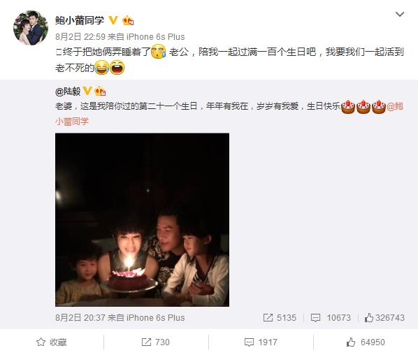8月2日,鲍蕾生日陆毅深情表白,随后鲍蕾转发表示要过满100个生日,深夜恶狠狠的撒了一堆狗粮,你们在这样还能好好玩耍吗?