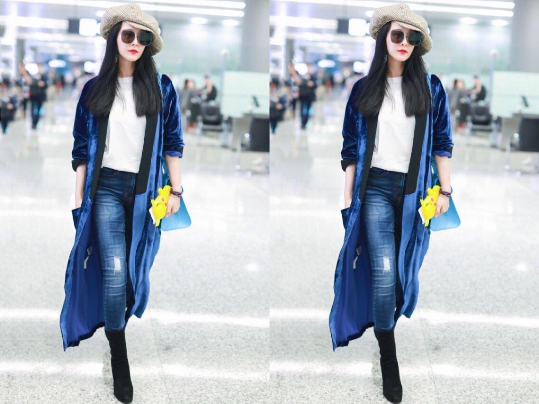 而现身机场的范冰冰也是十分喜爱这样的造型,同样的红唇黑发,配上一定贝雷帽以后显得特别的减龄小清新呢~黑发从两旁自然的下垂,对于脸超胖的小姐姐不妨尝试一下这样的小技巧,在穿搭也是特别显眼呢~蓝色的反光大衣,内搭白t加牛仔裤,悠闲而随性!