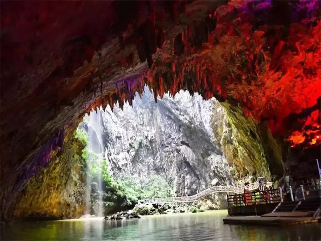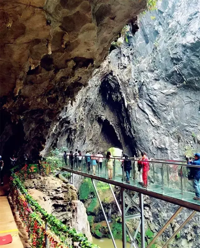 亚洲首创溶洞悬空玻璃栈道,洞顶有2个穿孔通天,光线从中透入洞里。