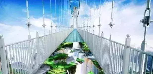 远看吊桥宛如一条龙,悬空倚在两山之中,炫酷3D的地画和玻璃桥相结合,在灯光的照耀下,会呈现出不一样的质感,站在上面,会给人身临其境的效果。