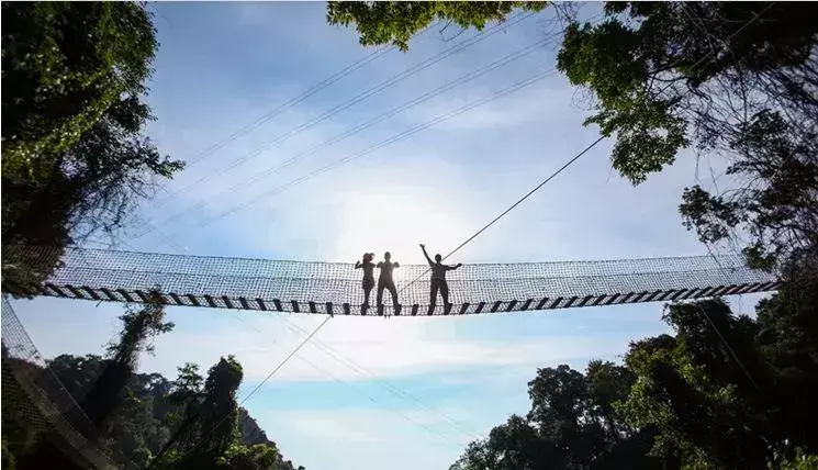 这是广东首条3D玻璃桥,全桥横跨龙凤山庄,走进这座桥的情侣会像牛郎织女那般,体验牛郎织女空中相会。