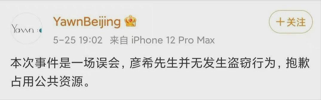 5月25号晚,该店主发微博称“彦希先生并无发生盗窃行为”并道歉。