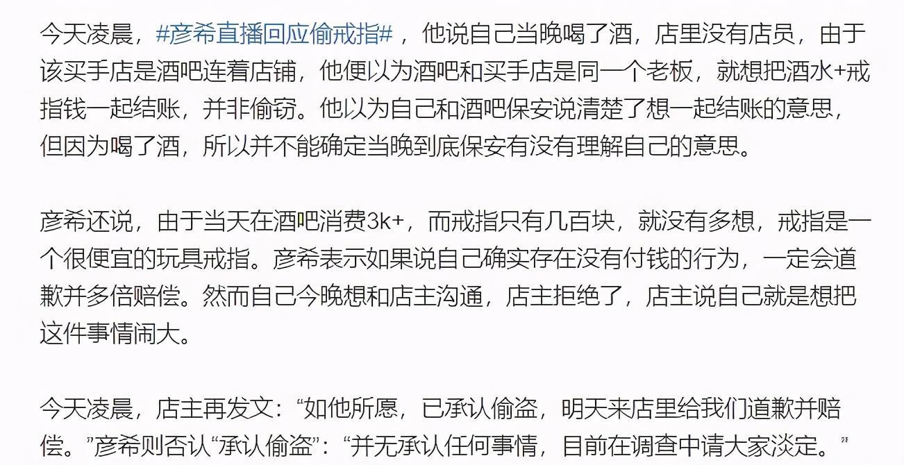 彦希还透露自己是常客,本来那枚戒指只有几百元,三千多都消费了,还偷一个几百的的东西,令人难以置信,对此不少网友也纷纷表示“不至于吧”“彦希这家境还偷东西”