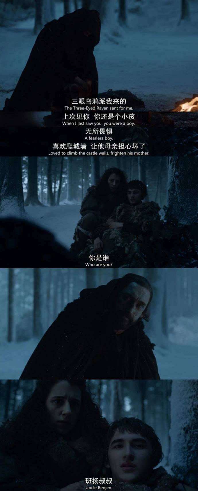 在第六季,有一黑衣人中途救下被异鬼围攻的布兰,布兰认出是班扬叔叔,但是手冰冷坚硬,全身毫无生气,而且不能通过长城,因为长城有魔法,这里看出班扬其实已死,但是还存在于世。绝境长城有魔法是不会让异鬼通过的,班扬叔叔好像真是异鬼!但异鬼都是冷血肆意屠杀人类的,班扬为何还好心救布兰?