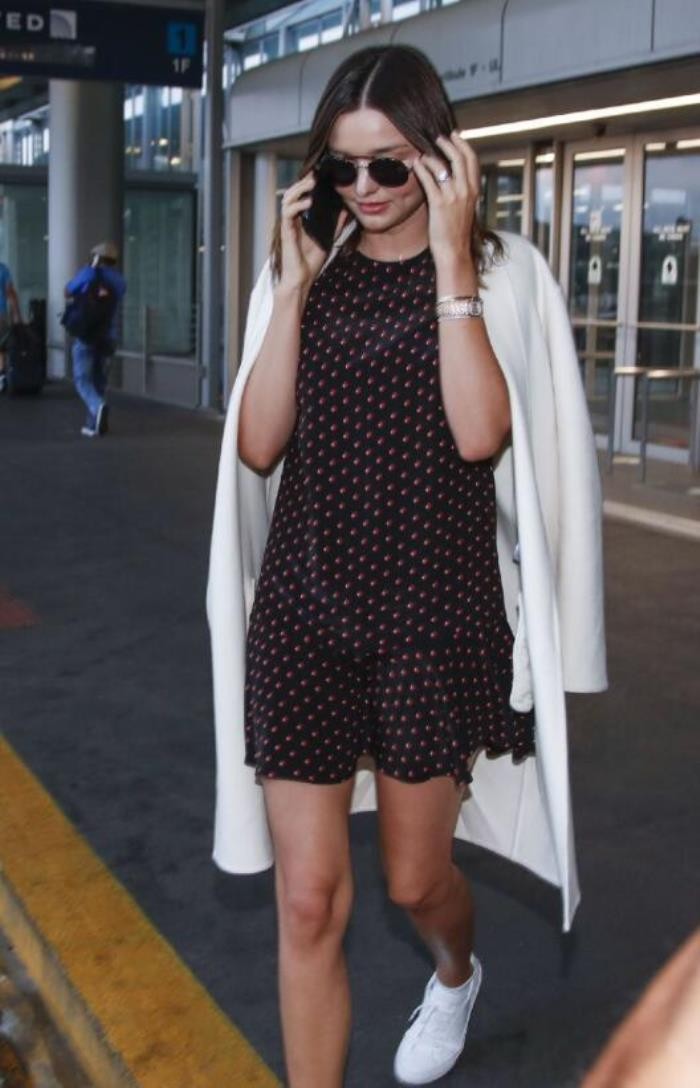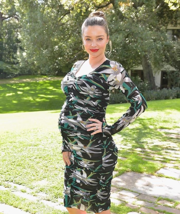 作为超模,米兰达·可儿除了肚子隆起来之外,其他的部位基本都没有什么变化!脸还是这么小,胳膊还是这么细!所以她更喜欢穿紧身的连衣裙来展示自己的身材,这条黑绿色印花裙十分高贵迷人。