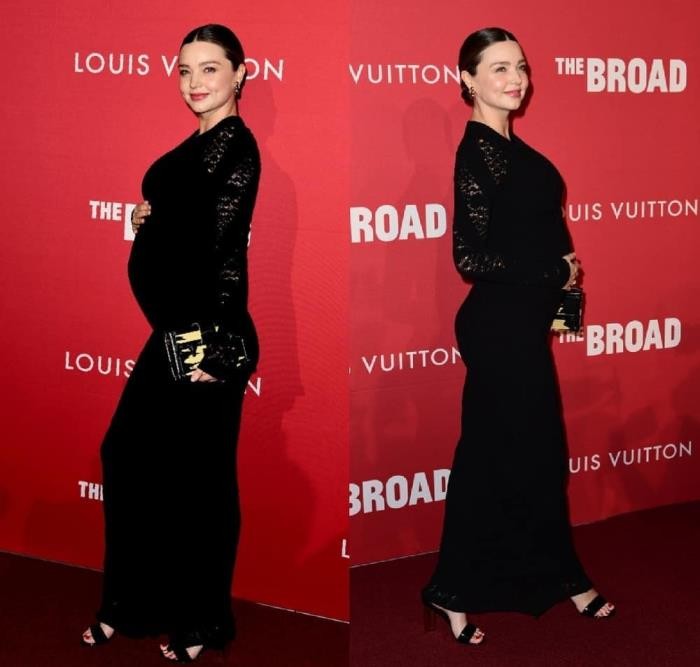 怀孕中的女人一样可以很性感!一身黑色的镂空紧身长裙十分优雅迷人,散发出满满的母爱光环,其实孕妇也可以很美!最重要还是得像米兰达·可儿这么的自信!