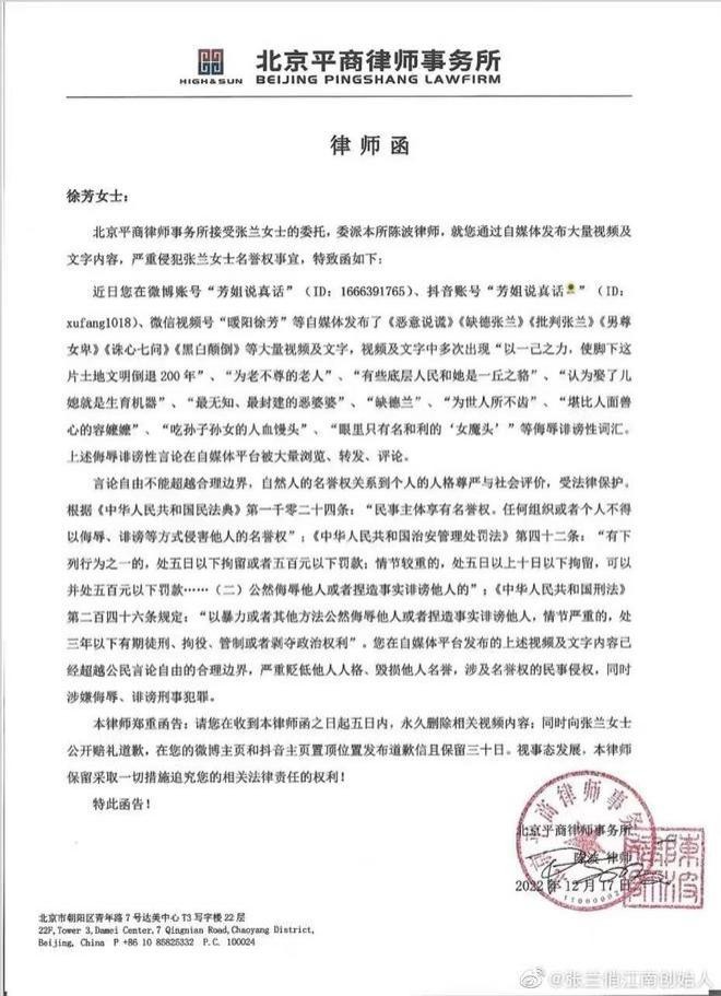张兰发律师函警告博主 督促其删除侮辱诽谤性言论
