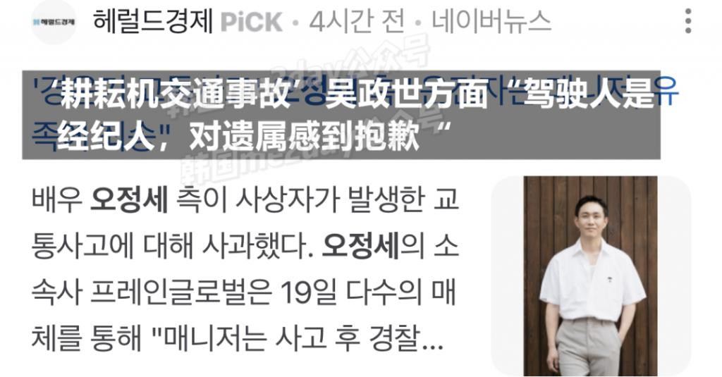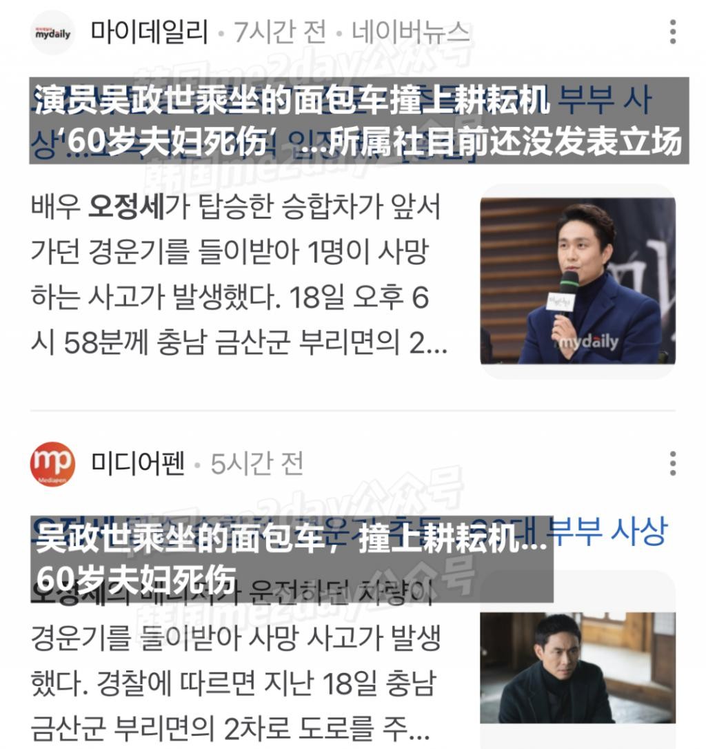 据多家韩媒报道,本月 18 日下午 6 时 58 分左右,在忠清南道锦山郡附近的 2 车道公路上,吴政世经纪人驾驶的面包车撞上了前面的耕耘机。驾驶耕耘机的是一对 60 多岁夫妇,其中丈夫死亡,妻子受重伤,被送往医院。