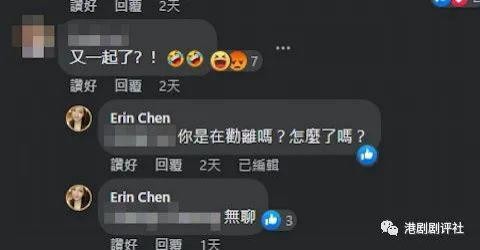更见林利捉实 Erin 合照,更露出手上的「婚戒」晒恩爱。更有人发现 Erin 把上月答应「明天去离婚」改成了「找天去离婚」,有些网民在 Erin 的社交平台留言:「又一起了?」而 Erin 也毫不客气的回应:「你是在劝离吗?怎么了吗?」还把一些说话难听的人加了黑名单。