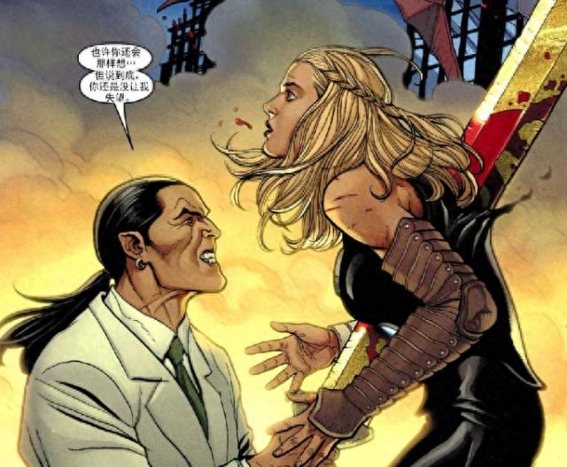 争吵过后,战斗力超强的瓦尔基里,Zadra等人被洛基手下的阿莫拉所魅惑,开始攻击自己人,分别重伤了钢铁侠和美国队长,美队的盾牌被这黄金剑砍下去直接裂开