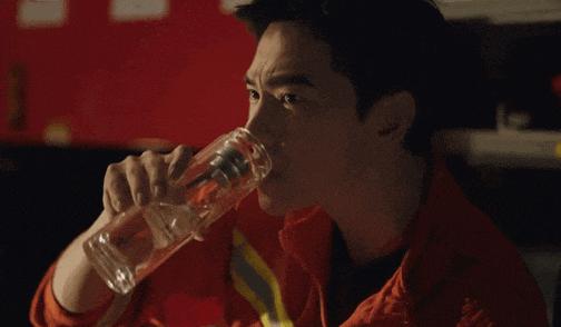 一个喝水的简单动作,他下意识的就要摆几个定点,就为了突出他完美的下颌线。