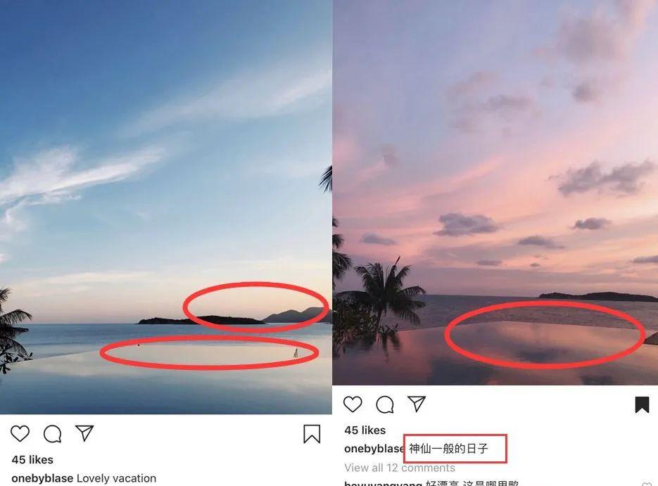还在 ins 发了张和湾湾几乎一模一样的泳池,