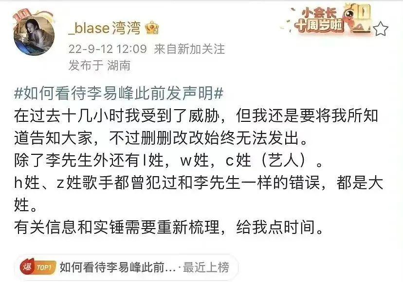 这件事本来因为李易峰的间接澄清又要揭过去,谁知,9 月 10 号," 李易峰 " 和 " 三字男明星 " 的词条双双登上热搜,