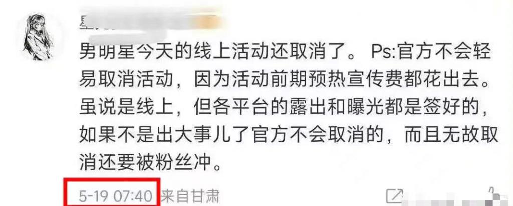 到了 5 月 19 号,该爆料博主又表示该男星当天的活动被取消,