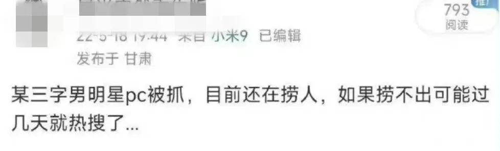 虽然 9 月才被通报出来,但其实早在五月份,就有人放出过消息,称某三字男明星 pc 被抓,目前还在捞人,