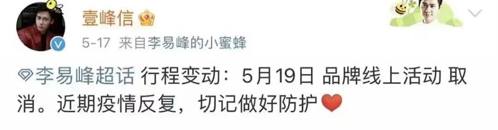 在粉丝忧心忡忡的时候,李易峰开了个直播,告诉大家是因为疫情才取消活动,给了粉丝们一颗定心丸,