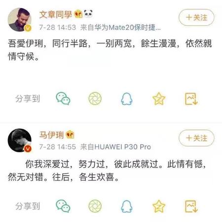 7月28日,文章马伊琍通过微博宣布离婚,结束了二人十一年的婚姻。文章发文“吾爱伊琍,同行半路,一别两宽,余生漫漫,依然亲情守候”,马伊琍发文“你我深爱过,努力过,彼此成就过。此情有憾,然无对错。往后,各生欢喜 ”。