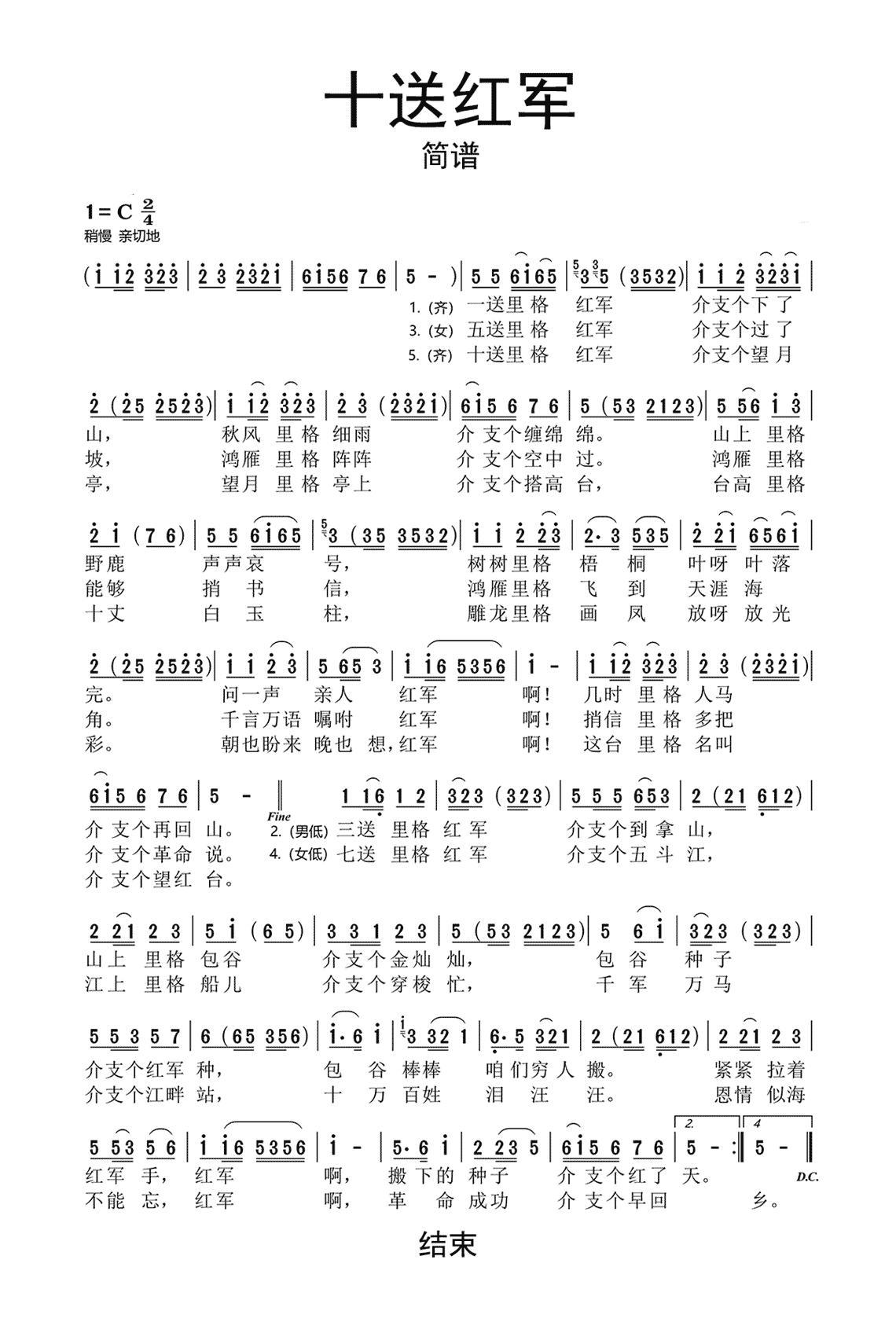 十送红军的含义就是红军当时走了十次!又来十次! 十送红军赞扬了红军为革命不怕牺牲,不辞劳苦,热爱祖国,热爱人民,一心一意为人民服务的崇高理想,和老百姓相处如鱼得水,浓厚的感情胜过亲人。 歌声悠扬凄婉,如泣如诉,再现当时“千军万马江畔站,十万百姓泪汪汪”的历史画面。