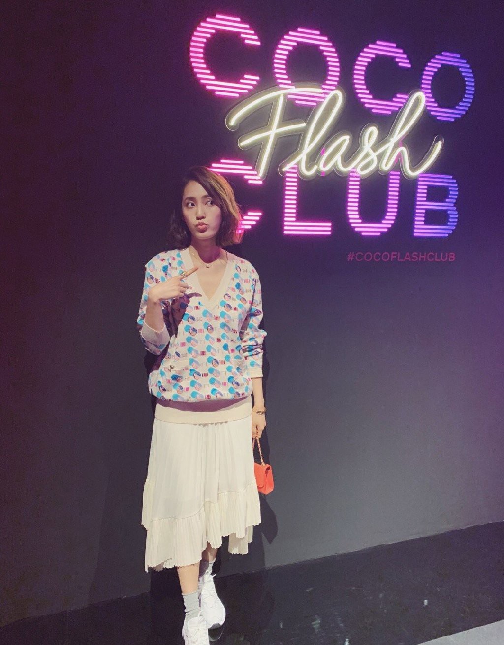 王棠云模特出道,驾驭起各种风格来游刃有余。她身穿v领针织衫,秀出美好的锁骨,休闲又舒适。搭配百褶纱裙和白色老爹鞋,这样的穿搭十分减龄,少女气息十足。王棠云手拿橙色小皮包,十分亮眼活泼。