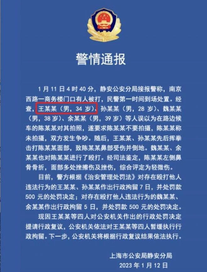 此前,王思聪因在马路上与好友怀疑路人偷拍而殴打路人,双方发生口角,王思聪一行人对路人实施暴力。事后路人报警,警方介入调解。
