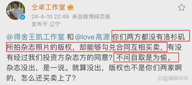 而有关王凯方与摄影师高源私下买卖照片的行为,郭涵也明确表示:当时杂志电子版已经过审,只需要王凯方出具形象授权就能顺利引入内地刊发。在联系王凯经纪人的时候才得知,王凯方已经在和高源私自买卖照片。