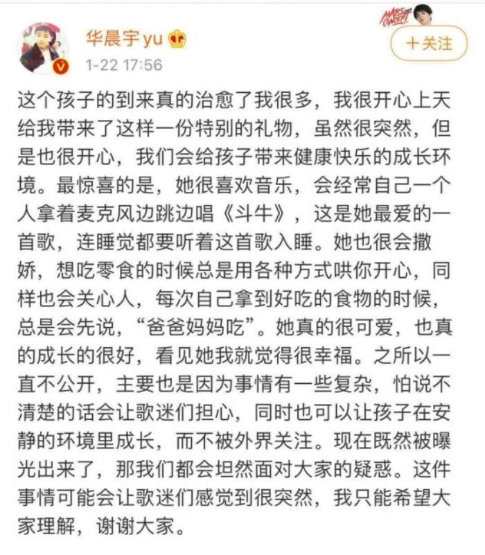 1月22日,张碧晨与华晨宇承认生娃后,二人与女儿的合照也随之曝光。华晨宇单手抱娃爸爸力十足,小公主安稳的坐在爸爸手上。一旁的张碧晨则稍显轻松,手中拿着展板看起来状态相当不错。