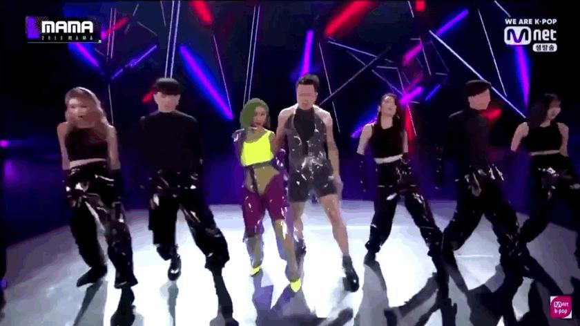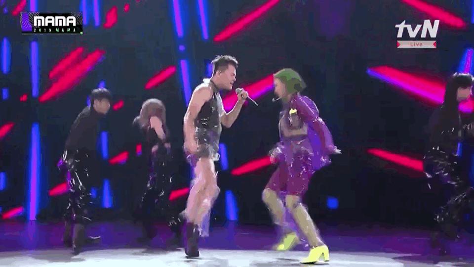 2025 年 MAMA 颁奖礼时,JYP 身着紧身短衣裤套装 + 透明雨衣外搭,与华莎热舞、