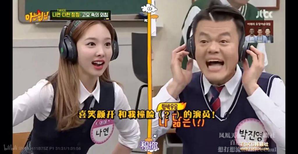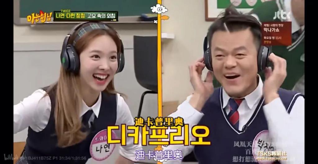 在和 Twice 上《认识的哥哥》玩 " 寂静中的呐喊 " 时,主持人给了莱昂纳多迪卡普里奥的题目让娜琏比划,JYP 负责猜。