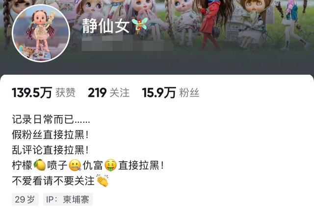 据悉,该网红某短视频账号名为 " 静仙女 ",拥有 16 万粉丝,或许是静仙女本人也知道自己的生活会引起大家的热议,在她的主页写着 " 柠檬精 "、" 仇富 "、" 喷子 " 直接拉黑,并表示自己只是在记录生活。