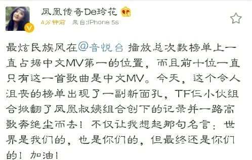 当《最炫民族风》保持多年的MV点击纪录,被新上线的TFBOYS《魔法城堡》一举超越,凤凰传奇的玲花在微博上说:“世界是我们的,也是你们的,但最终还是你们的!加油!”