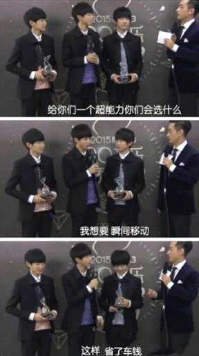 一次采访中,主持人问:“给你们一个超能力你们选什么?”王俊凯相当耿直:“我想要瞬间移动,这样省了车钱。”