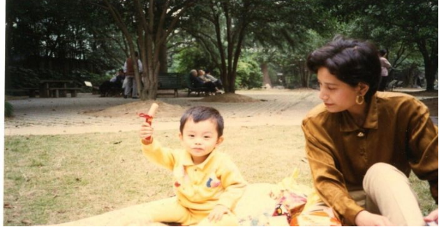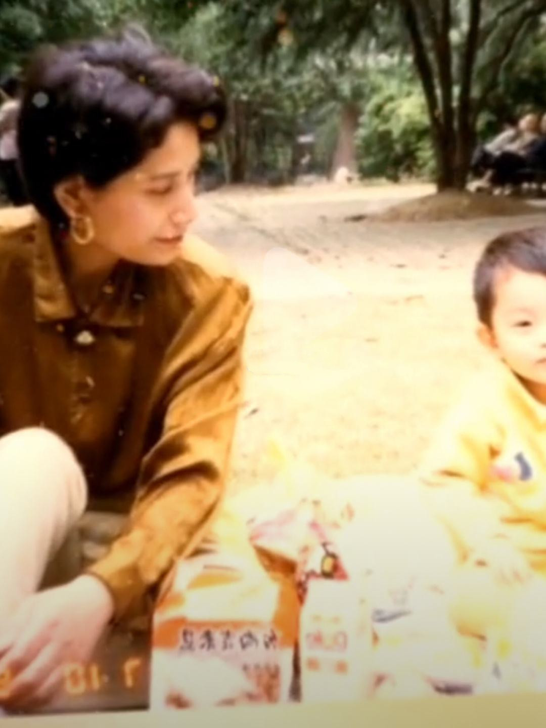 当时不到三岁的丁禹兮和母亲在公园野餐并留影,一旁的妈妈穿着真丝衬衫,戴着摩登耳环,颇有港星风范。