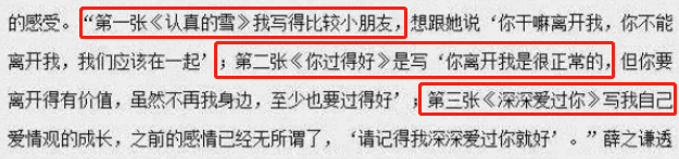 整整三张专辑都是写给那个女孩的,《认真的雪》我写的比较小朋友,《你过得好》是我对她的一种期盼,《深深爱过你》是对我们过去的总结”
