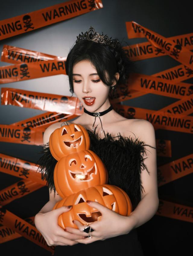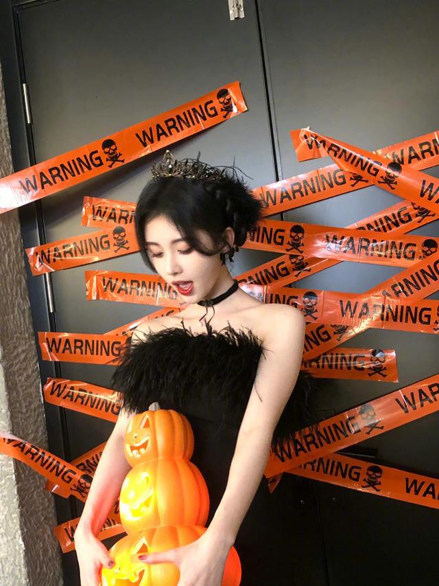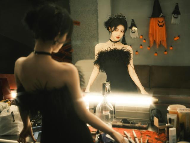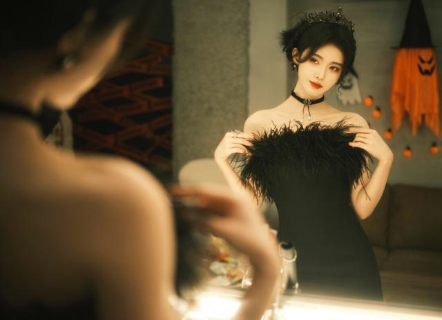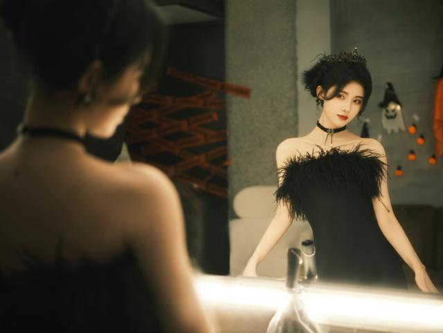 鞠婧祎晒皇冠造型大片 穿黑色羽毛抹胸裙秀肩颈线条