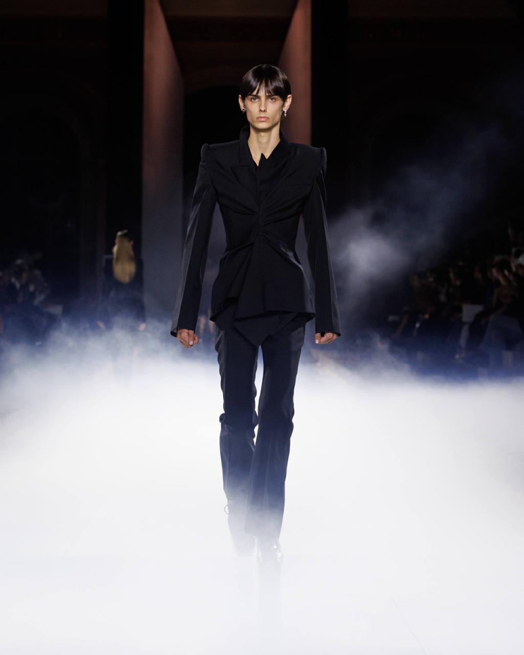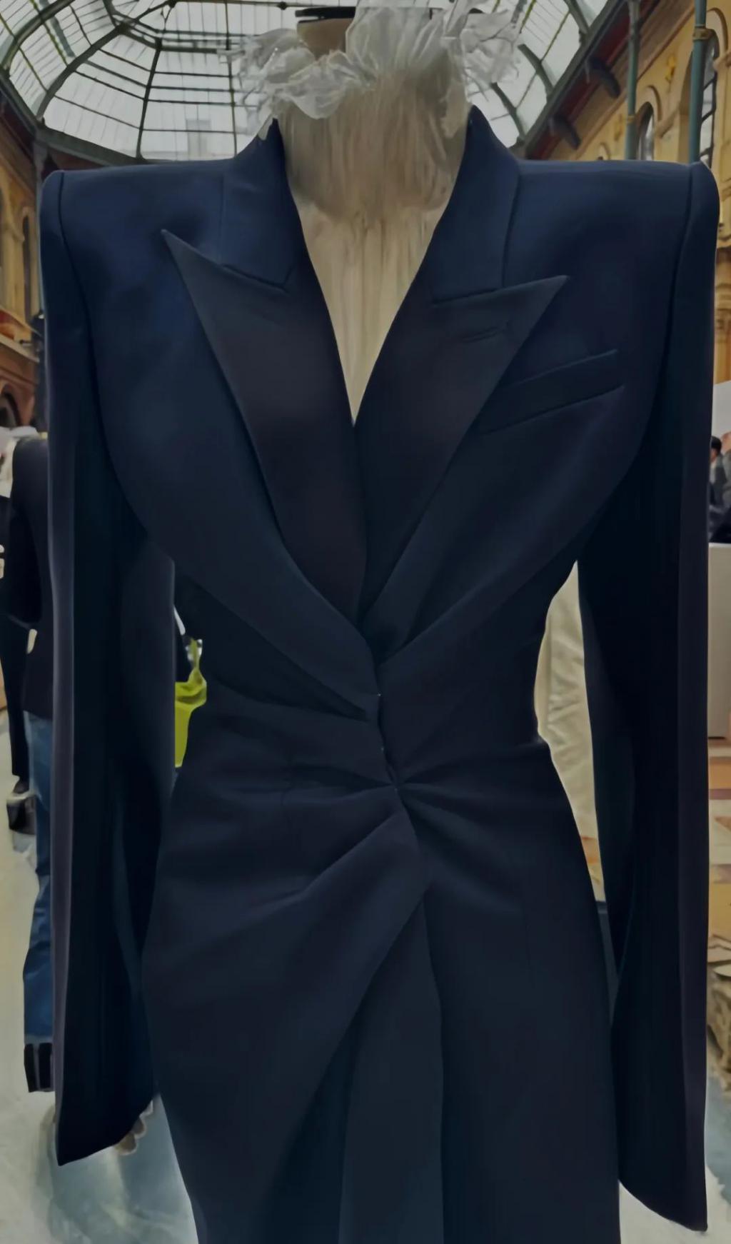 这样风格强烈的扭转效果,不光让腰身收得极好,还让原本四平八稳的英式西装里多了一些魅惑力。