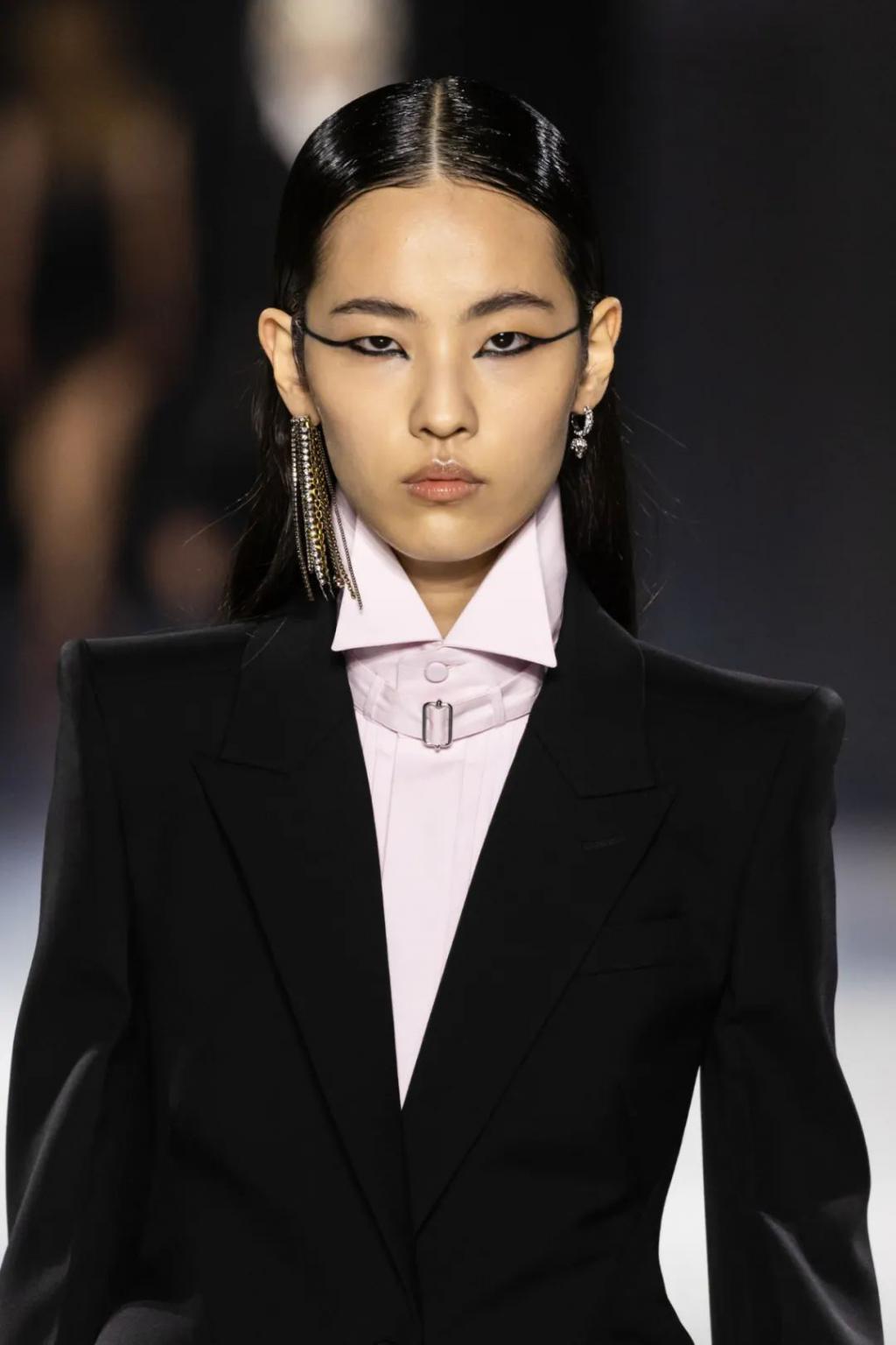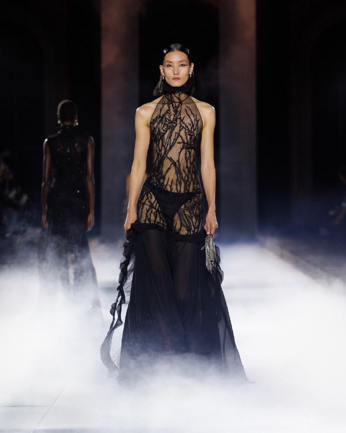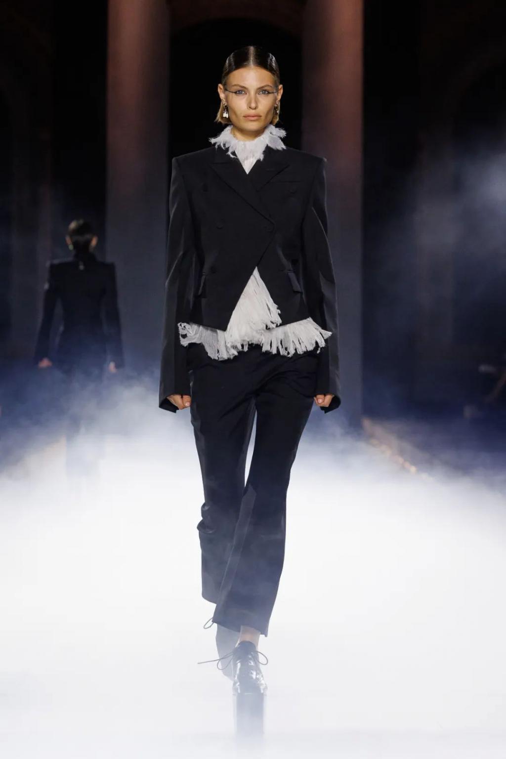 他在Alexander McQueen标志性的暗黑浪漫主义里考究地调入了一些属于当下的锋利摩登感。