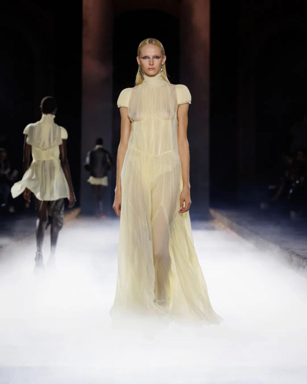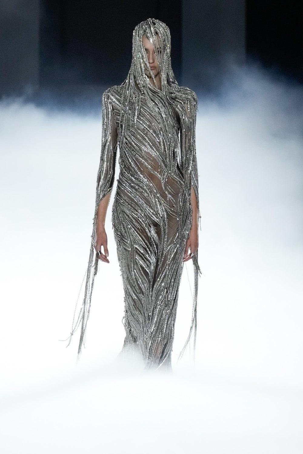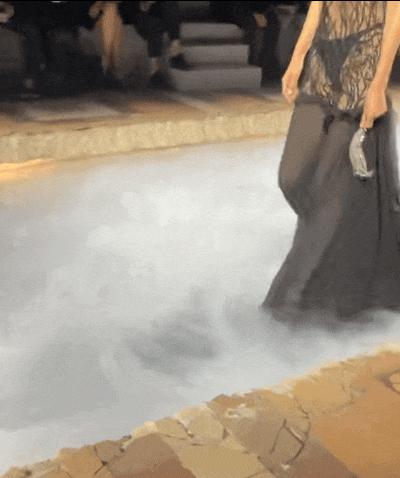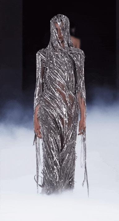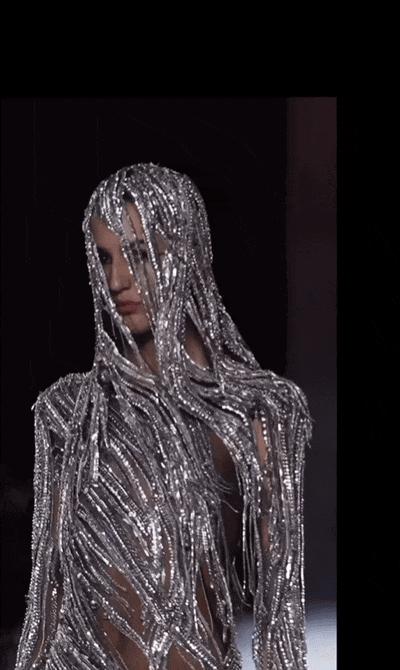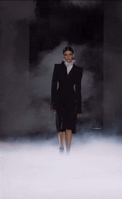 当身穿金属裙的模特出现在浓重雾气中时,真的营造出了某种神话氛围。神秘、肃穆、华丽中带着粗粝,有一瞬间让人幻视《沙丘》里的杰西卡夫人。