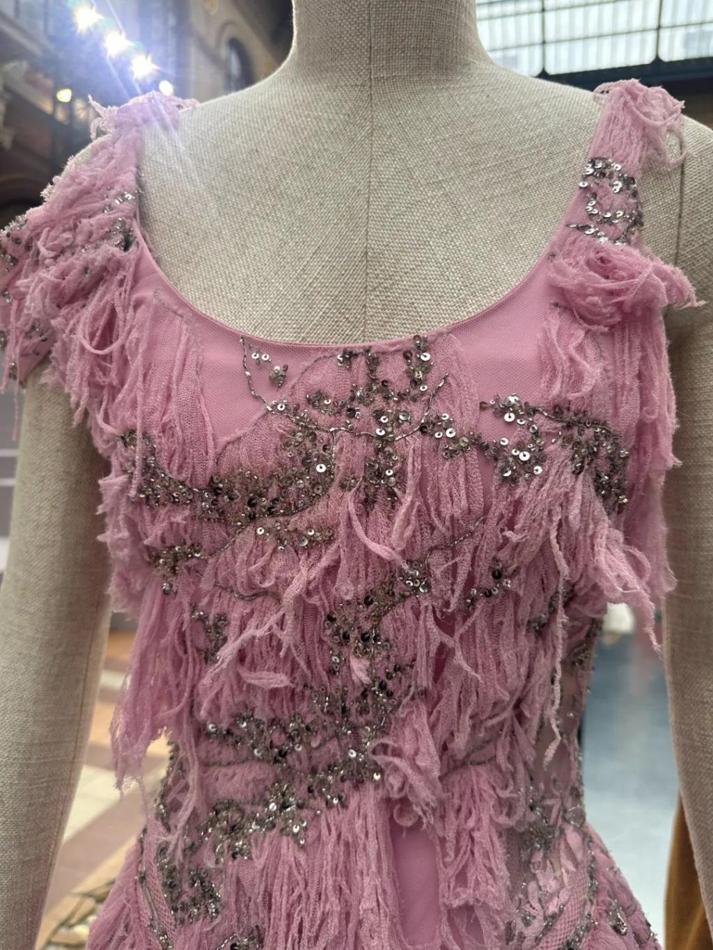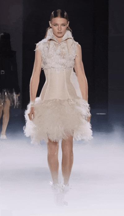流光溢彩的亮片,层叠的罗缎薄纱,还有考究的3D金属刺绣都体现着McQueen作为英国顶级时装品牌的工艺实力。