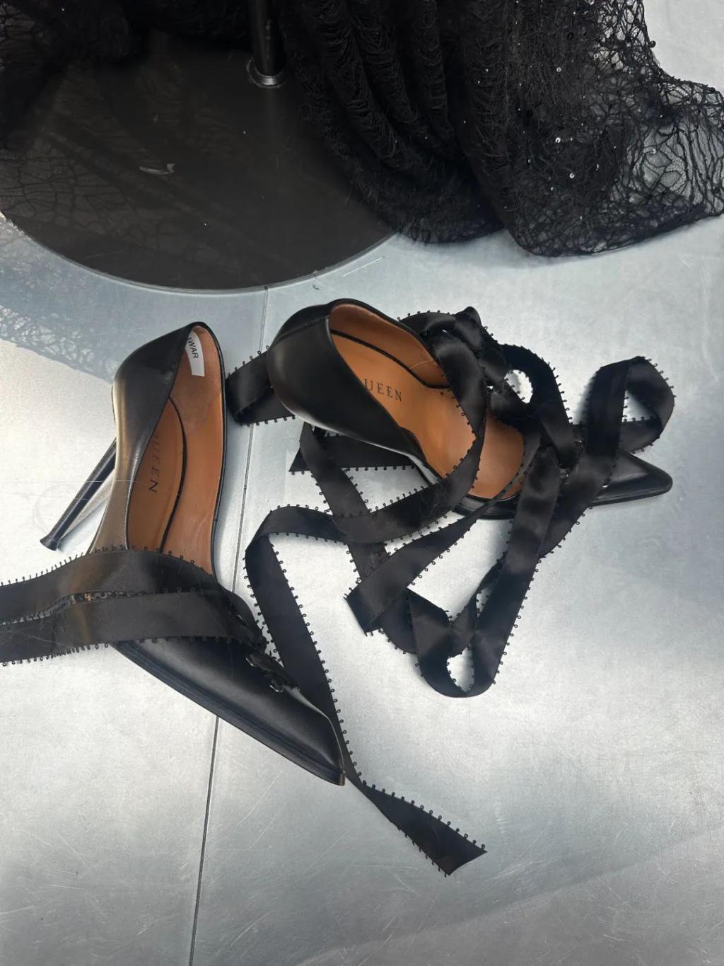 强势性感的黑色箭头高跟鞋,绑带上却装饰着密密麻麻的迷你扣袢,一眼看上去像是长了刺一样,怪可爱的。