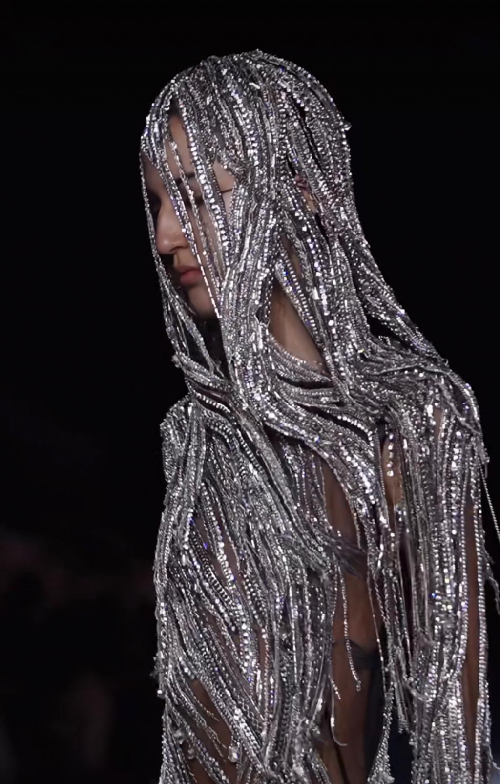 但全场最让人震撼的,还是这件金属拖尾链条长裙。