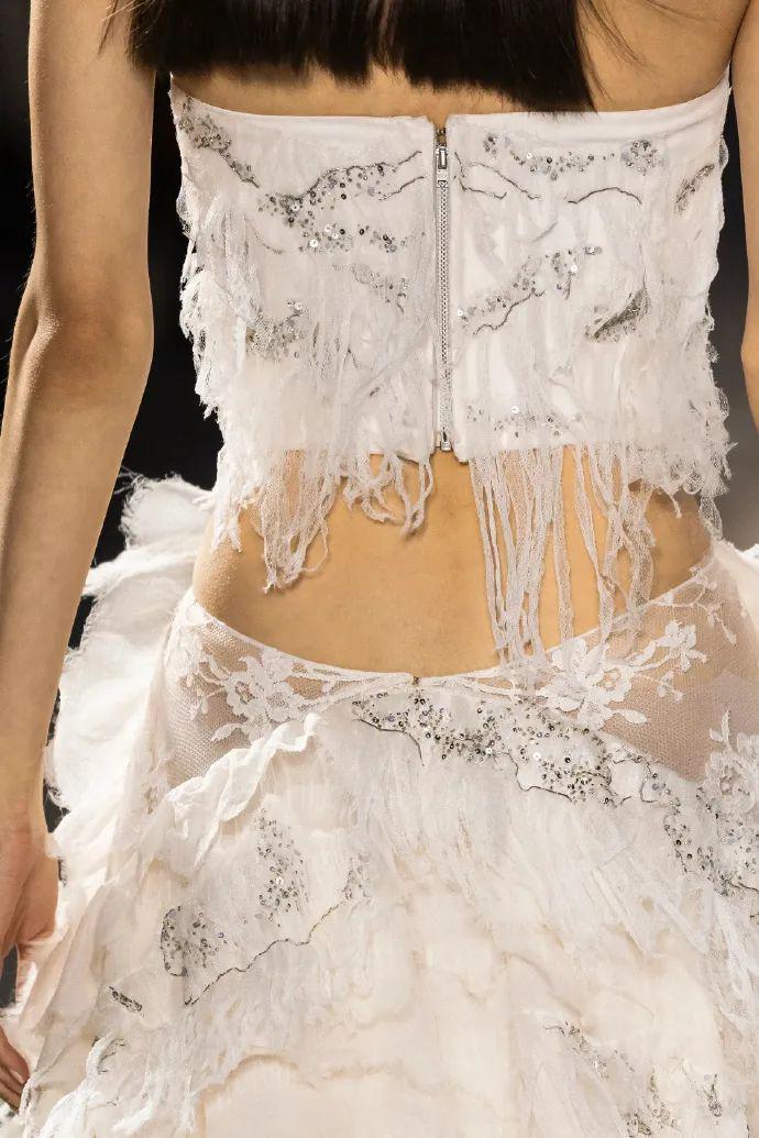 精细的白色蕾丝面料有着蜘蛛网一样错综复杂的结构,但Seán McGirr却故意将这么纤巧贵气的棉量手工被嵌入细腻的磨毛丝绸之中,打造出一种生涩野性的"未完成感",