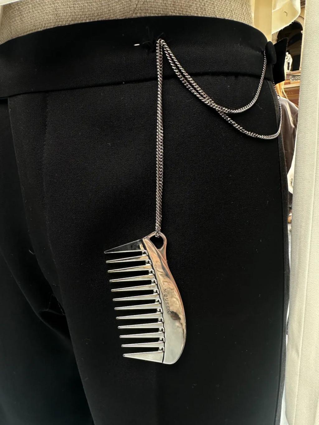 而这次秀上的配饰也一样很精彩。我在看秀的时候都没有注意到,原来裤链上挂着的装饰品,是一只小小的梳子。